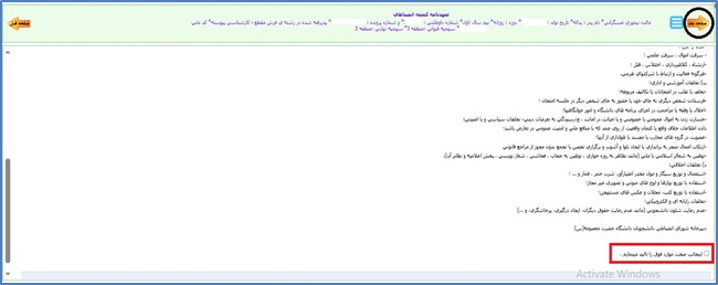 - صفحه تعهدنامه کمیته انضباطی: اعلام موافقت خود را با انتخاب گزینه " اینجانب صحت موارد فوق را تایید مینمایم" انجام داده و متعهد به مرامنامه انضباطی دانشجویان دانشگاه حضرت معصومه (س) میشوید