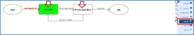 * نکته مهم: از این پس میتوانید وضعیت ثبت نام خود را در قسمت " گردش" مشاهده نمایید. توجه کنید زمانی که قسمت درخواست کننده سبز رنگ است، یعنی گزینه ارسال جهت بررسی را انتخاب نکرده اید لذا مجددا به فرم درخواست برگردید و "ارسال جهت بررسی" را انتخاب نمایید و زمانی که قسمت مسئول پذیرش و ثبت نام سبز رنگ است یعنی به درستی مراحل ثبت نام شما انجام شده و هم اکنون تحت بررسی مسئول مربوطه میباشد