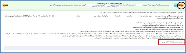- صفحه تعهد دانشجوی فعلی یا اخراجی یا انصرافی: در این صفحه با انتخاب گزینه " اینجانب صحت موارد فوق را تایید مینمایم" متعهد میشوید که فارغ التحصیل مقطع بالاتر ، دانشجوی فعلی و اخراجی در دانشگاههای دیگر نبوده و یا اگر بودهاید انصراف داده اید.