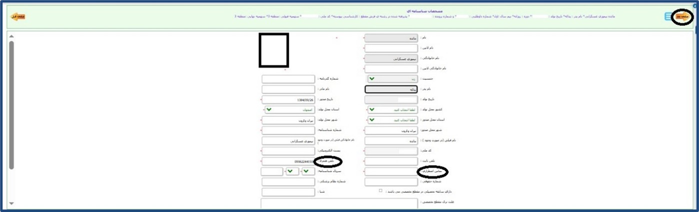 - صفحه مشخصات شناسنامهای: برخی قسمتها در این صفحه به صورت اتوماتیک بارگذاری شده و قابل تغییر نمیباشد، شما قسمتهای خالی و ستاره دار را تکمیل نمایید همچنین عکس 4*3 اسکن شده را نیز بارگذاری نمایید