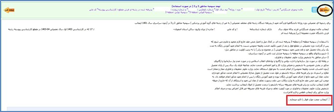 - مرحله دوم: ثبت نام حضوری ← که از شنبه 1404/07/26 تا 1404/07/28 به تفکیک رشته، از ساعت 8 الی 15 انجام خواهد شد.